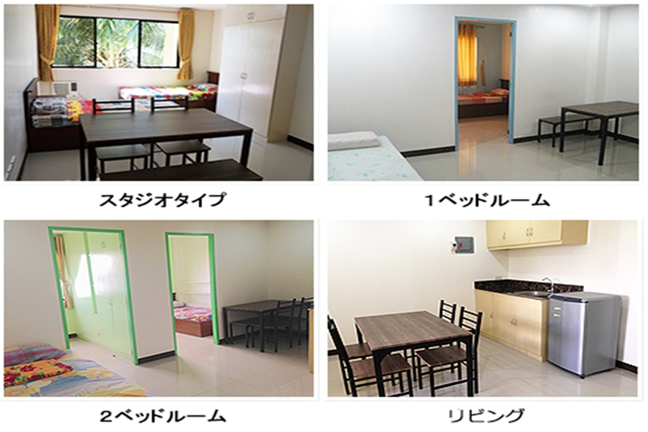 | 洗濯/掃除 | 洗濯:29ペソ/1kg(1Fランドリーショップ)、 屋上に洗濯機あり(各自)、週2回(ニューキャンパス) 掃除:週2回(内部寮)、週7回(ホテル寮) |