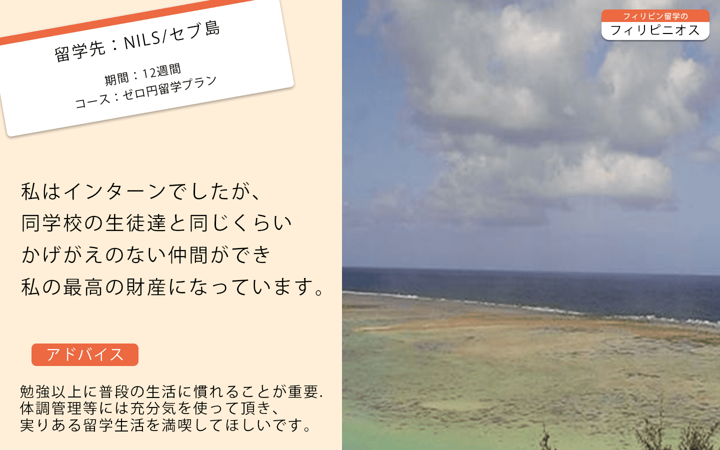 / フィリピン留学・セブ留学体験談 / 【NILS】takachiさんの体験談/インターン/16週間