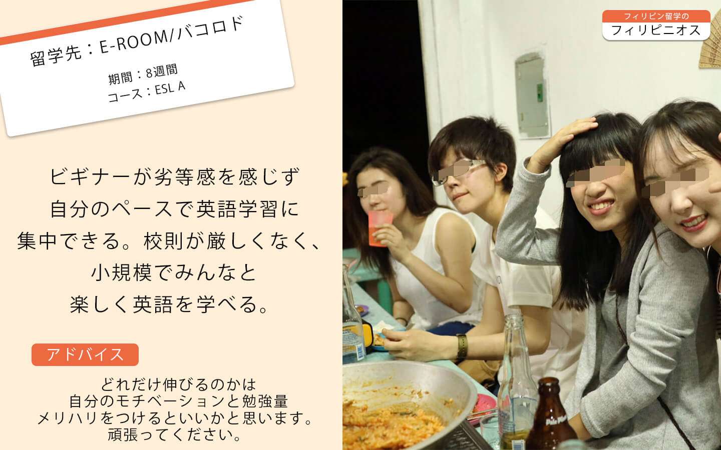 / フィリピン留学・セブ留学体験談 / 【E-ROOM】みんさんの体験談/ESL-A/8週間