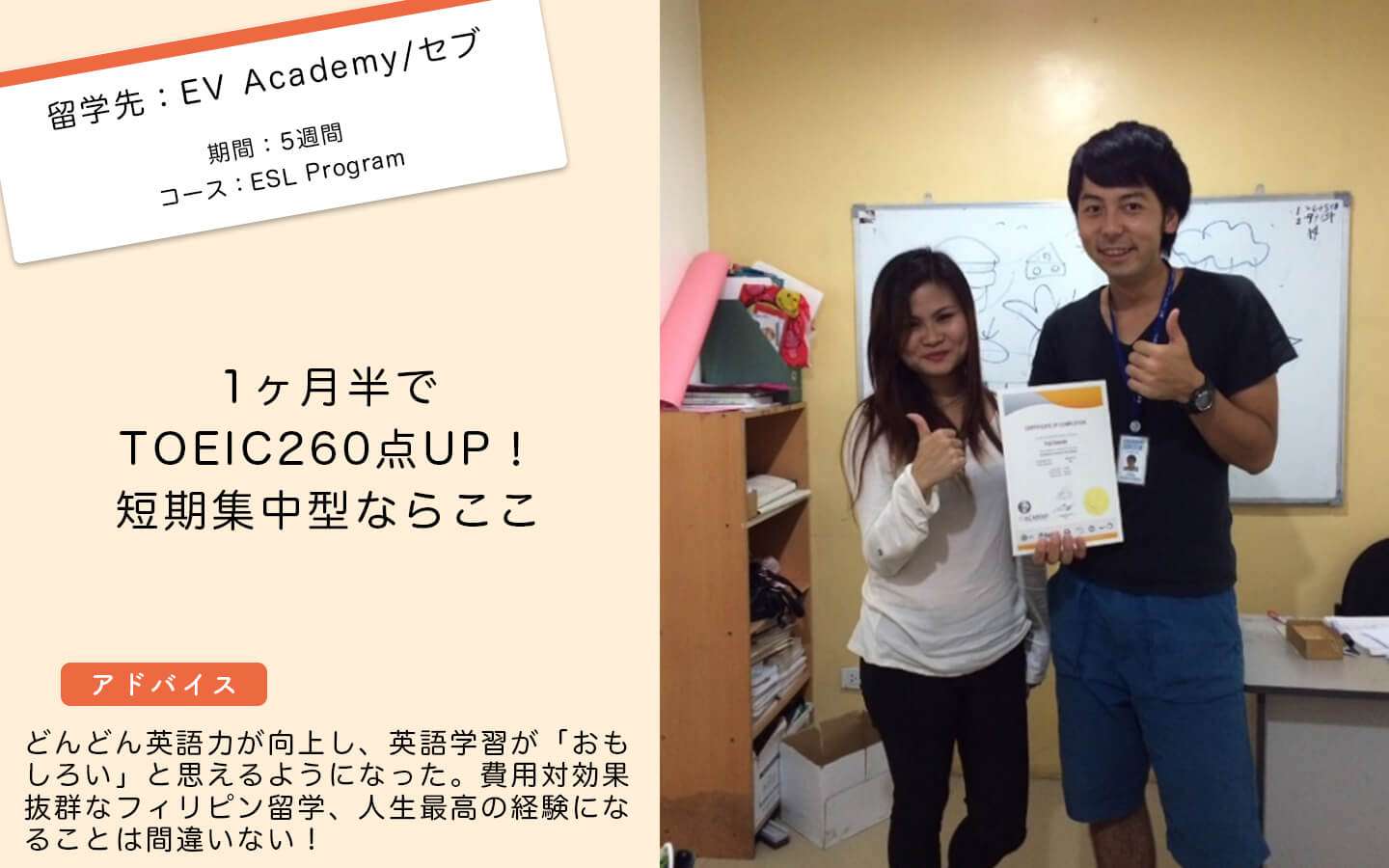 ぜひフィリピン留学にチャレンジして頂きたい!英語力を伸ばしてビジネスを円滑に進めたい、旅行をもっと楽しみたい、海外の人と付き合いたいなど英語を学ぶ動機は人の数だけあると思う。その思いを実現するためにフィリピン留学はうってつけである。私も最初は英語に自信がない状態でEvacademyの門をくぐったが、フレンドリーかつ丁寧な先生の授業に加えて、一緒に英語力向上という目標に向けて努力している仲間に支えられることによってどんどん英語力が向上し、英語学習自体が「おもしろい」と思えるようになった。費用対効果抜群なフィリピン留学、人生最高の経験になることは間違いない!