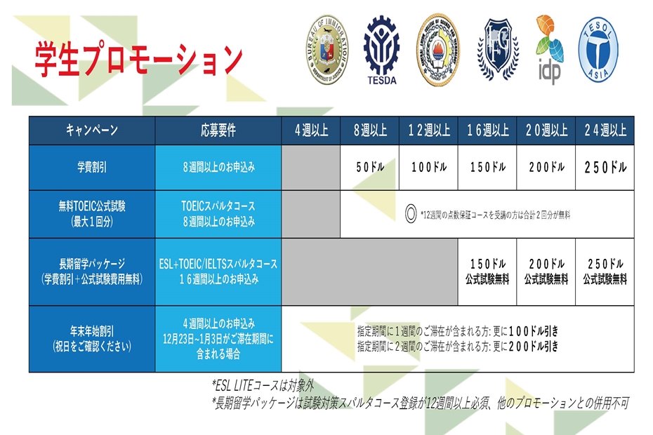 8週間以上のお申し込みでで50ドルの割引?250ドル引き