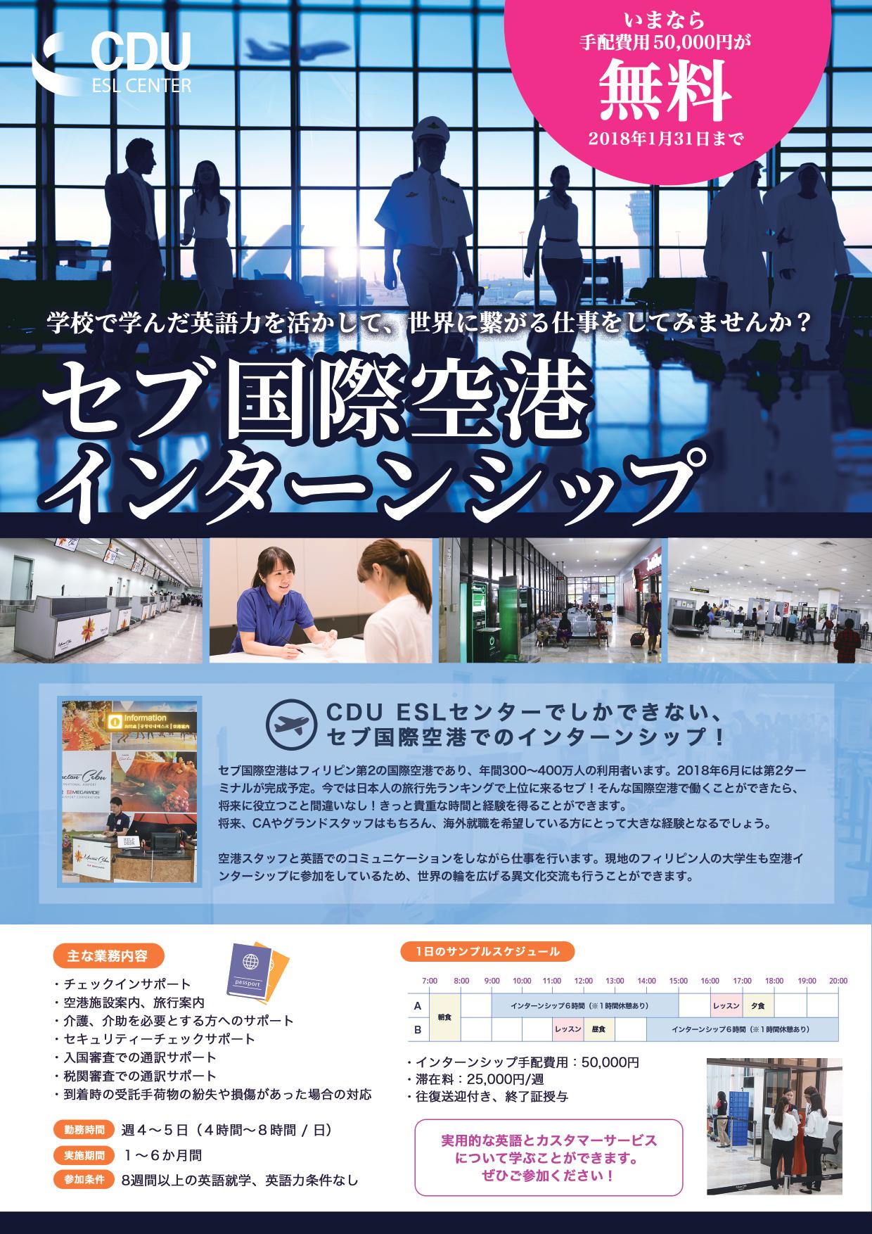 CDU ESLセンターでは、CDU ESLセンターにて8週間就学した学生を対象にセブ空港でのインターンシップに参加できるプログラムを提供しております。