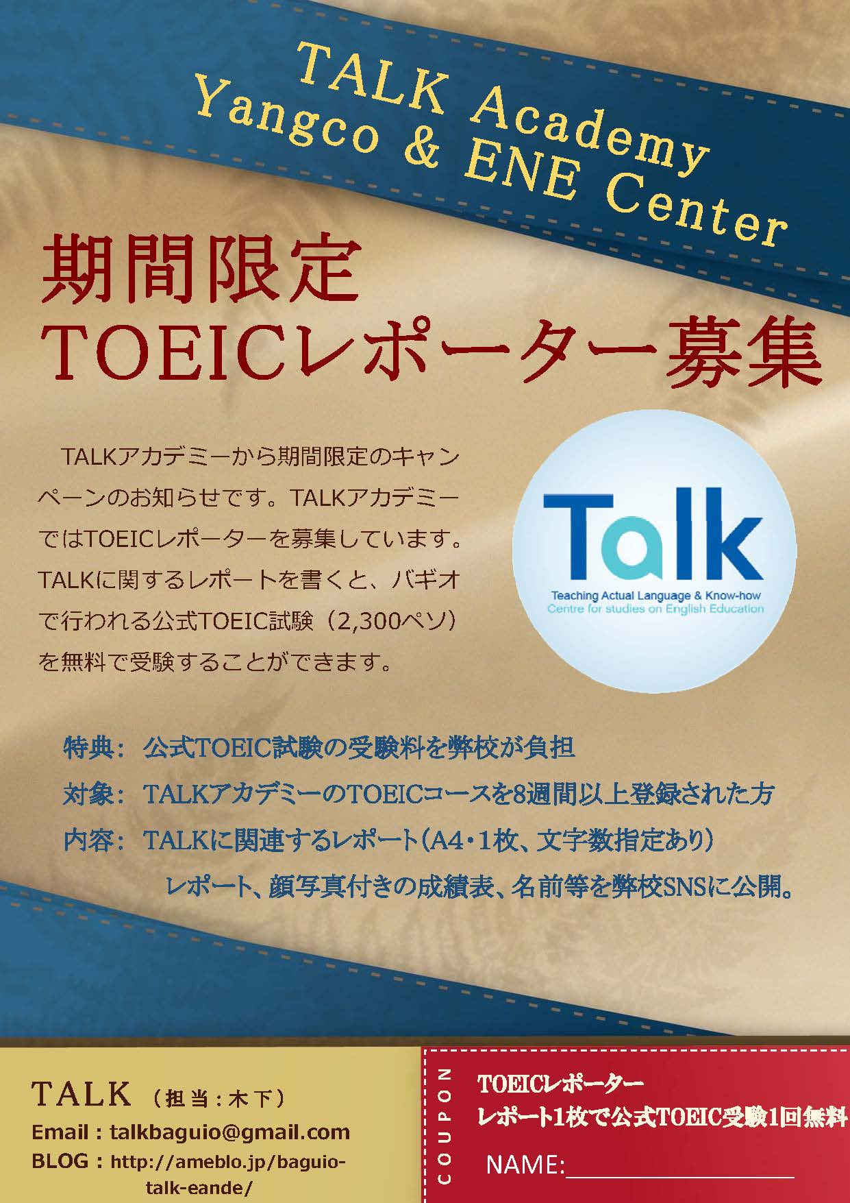 ※割引ご利用の生徒様には留学中にTALKに関する感想文、またはアンケート回答のご協力、またTOEIC、IELTSスコアを学校SNSに使用させていただくことがございます。(ニックネーム使用可)