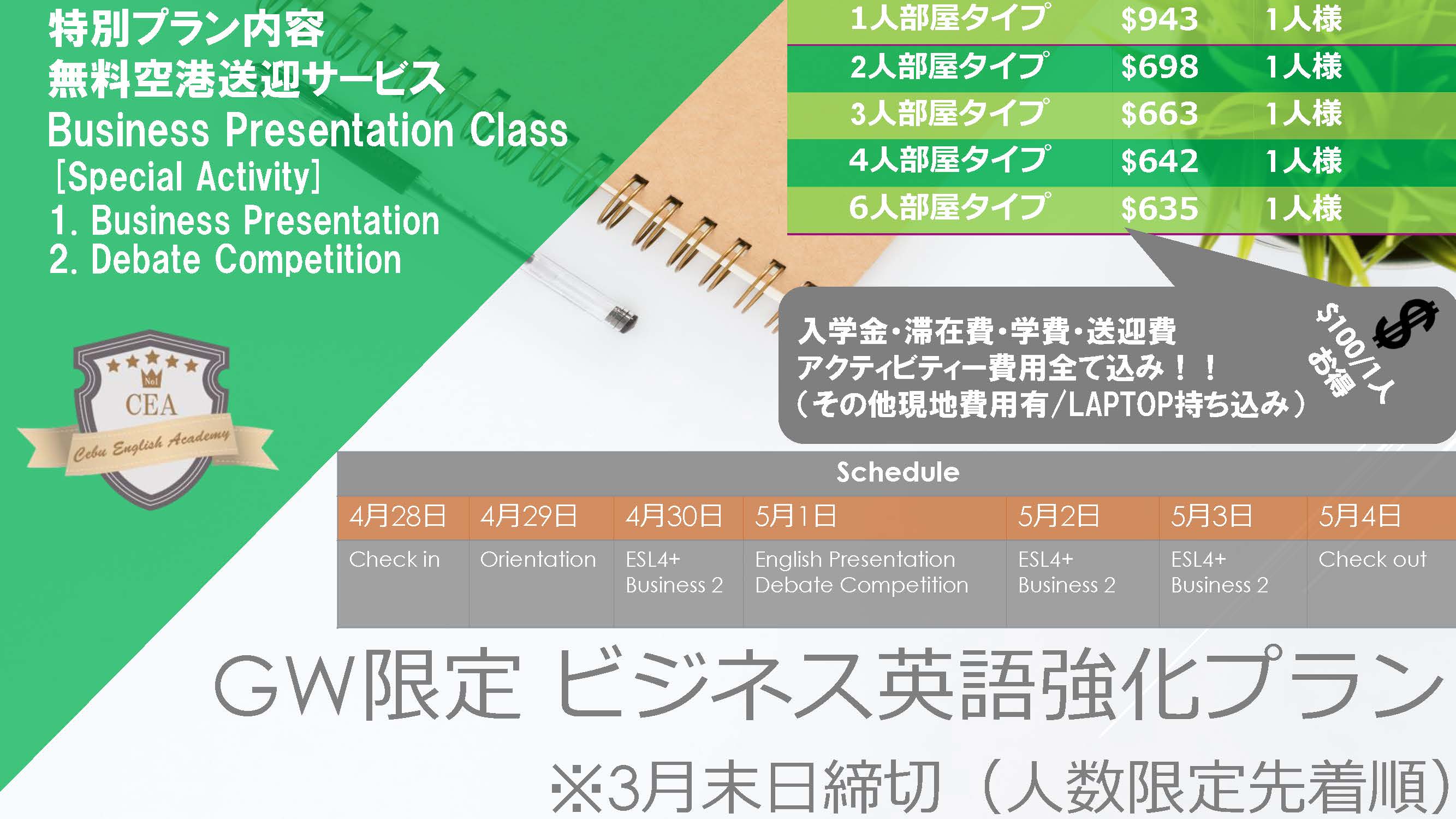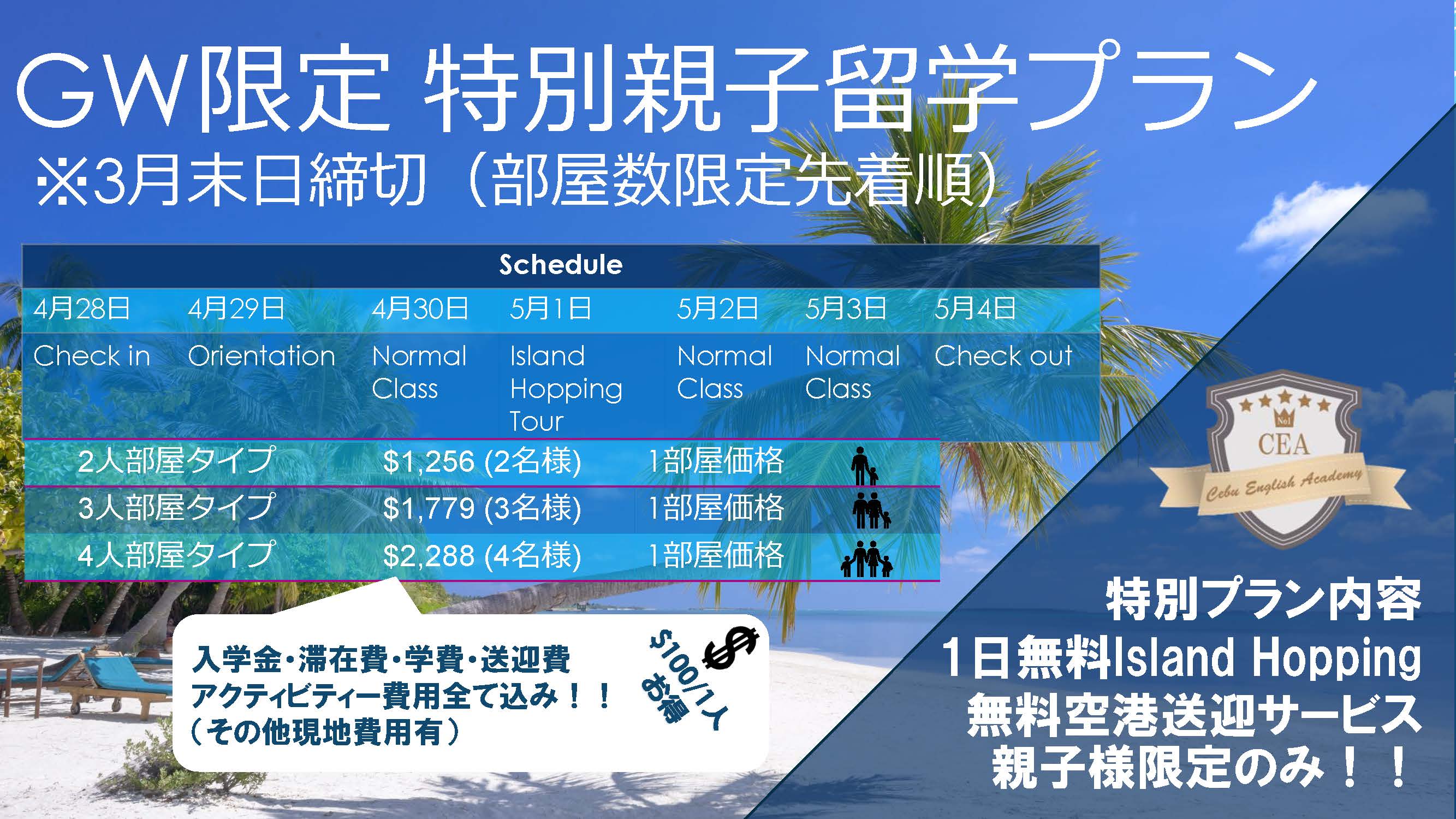 この度、2019年ゴールデンウィーク期間(1週間) GW特別プラン 1.親子留学プラン(無料Island Hopping等特典付き) 2.ビジネス強化プラン(無料アクティビティー+追加ビジネスクラス)