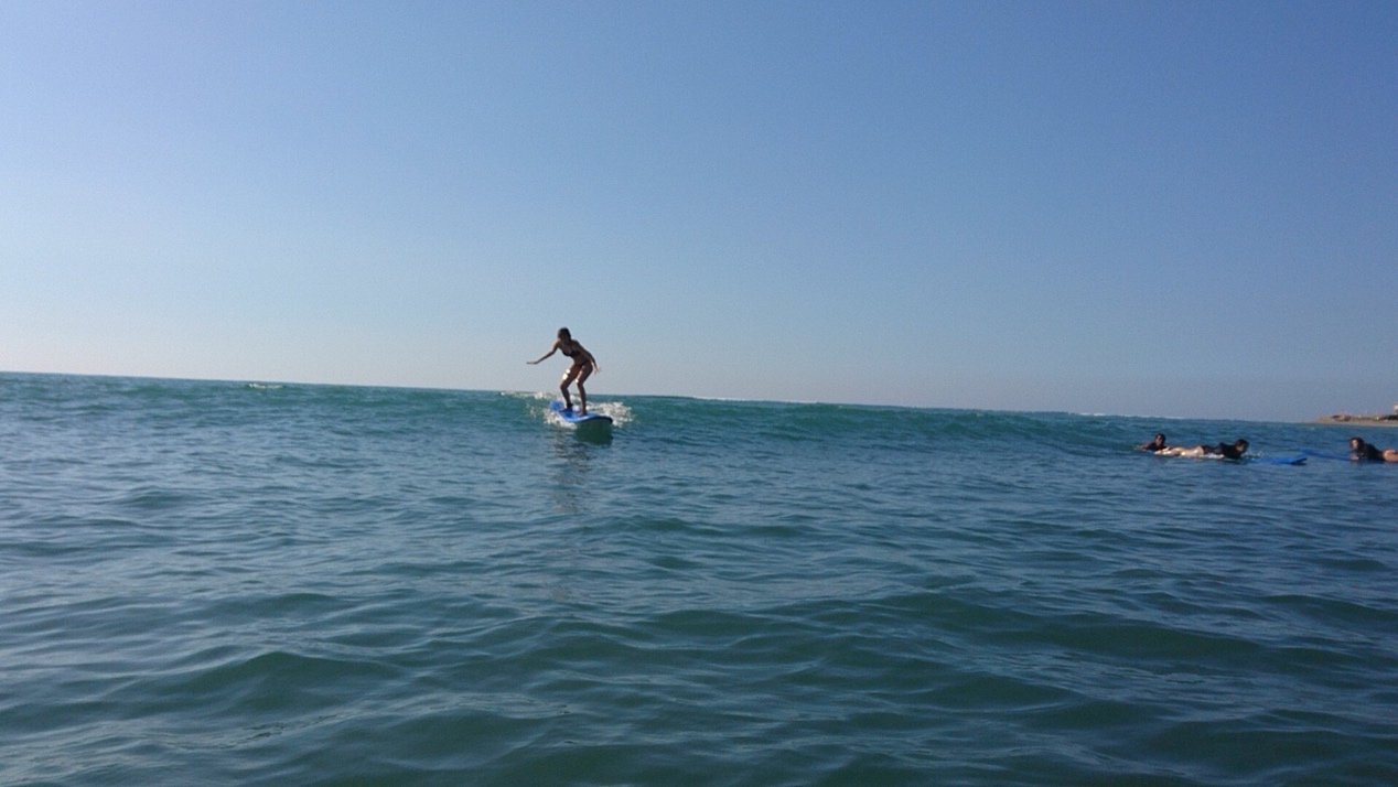 海に入ってからは先生が波のタイミングでボードを少し押してくれるのでそのタイミングで立ち上がります!