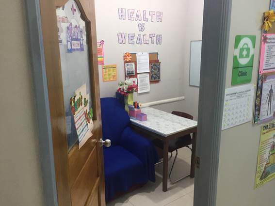 常駐の看護師さんがいます。とてもフレンドリーな女性の方で安心できます!体調が悪いと感じたら、ここに行くかメインエントランスに申し出てください。