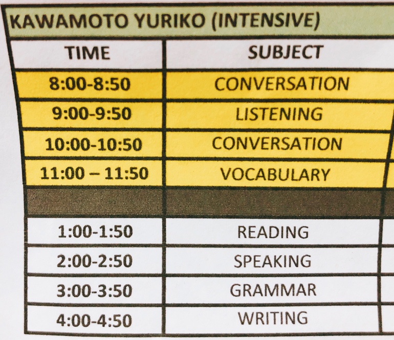 これが私の毎日の時間割です!私はINTENSIVEコースで1日8時間授業です。